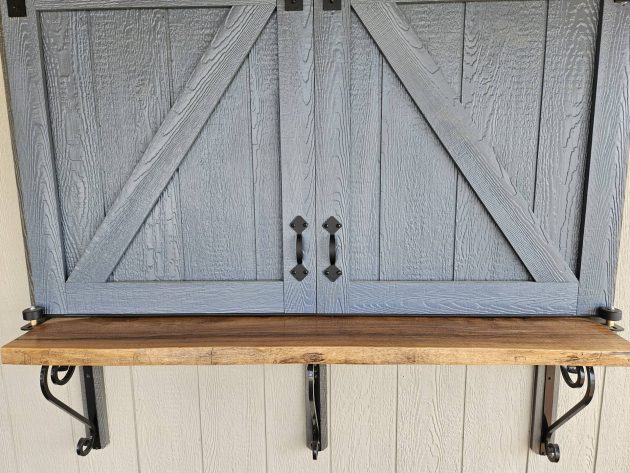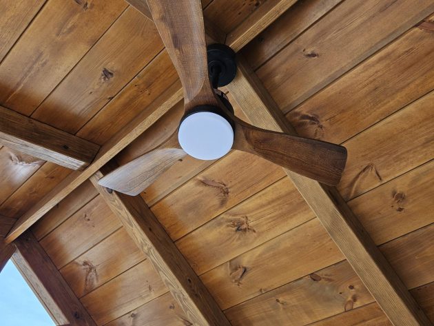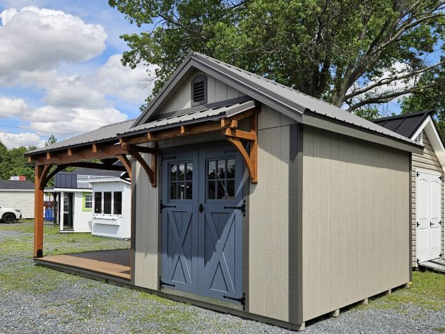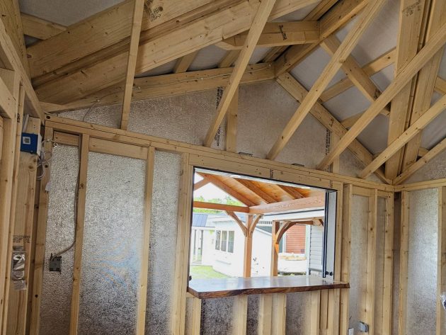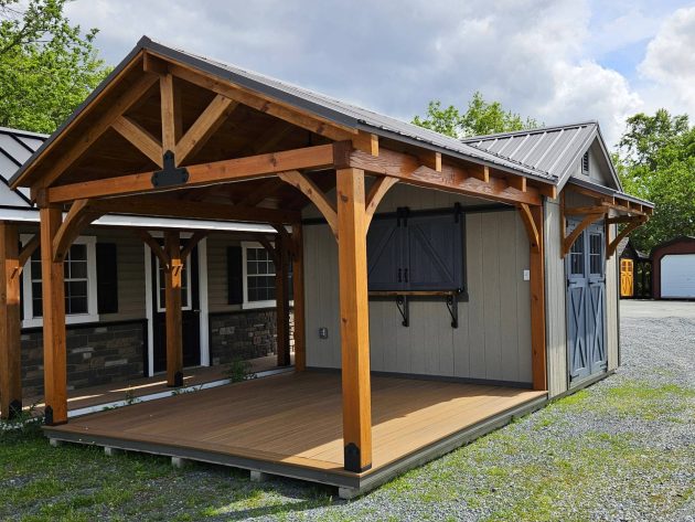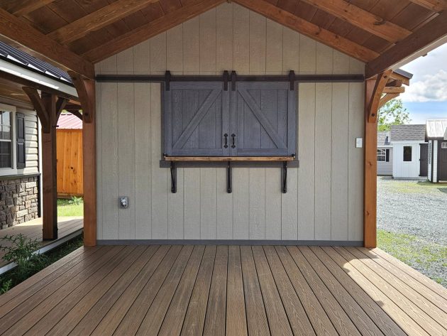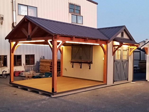 Upgrades: 12x12 Pavilion area, 12x10 shed area, textured metal roof, Double Bubble insulated ceiling in shed, 2' Timber frame door overhang with soffit lights, 5' live edge black walnut bar table with rolling doors, rope lights and exterior ceiling fan in pavilion
